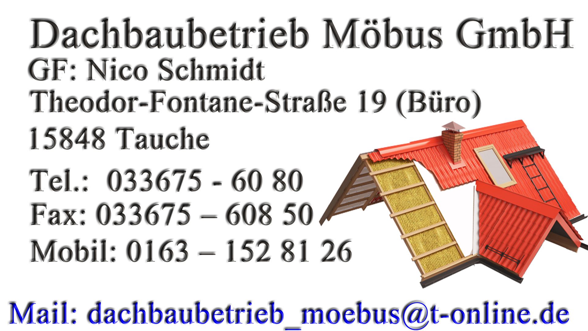 Dachbaubetrieb Möbus Inhaber: Nico Schmidt 15848 Tauche Theodor-Fontane-Straße 19 (Büro) Tel.: 033675 - 60 80 Fax: 033675 – 608 50 Mobil: 0163 – 152 81 26 Mail: dachbaubetrieb_moebus@t-online.de